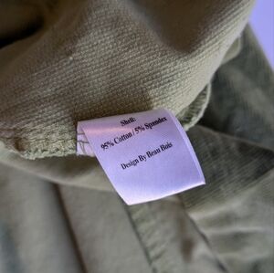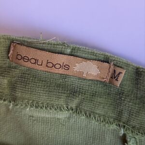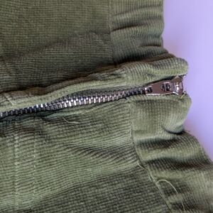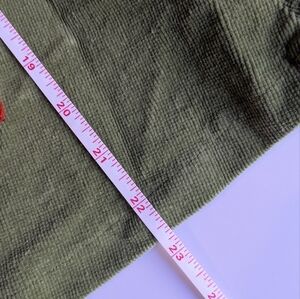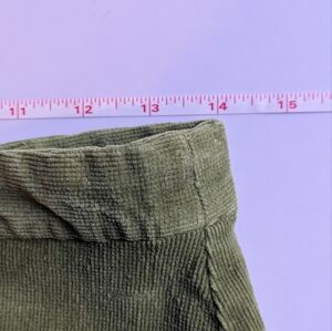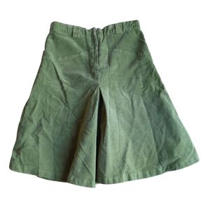 This casual green corduroy midi skirt features a vibrant green hue and a flattering A-line silhouette. The pleated design and the embellished details provide a unique flair. It is cotton and has some stretch. Very soft and very comfortable! and it has pockets!!! I got it in the early 2000s. I think it would be more of a size small today - please check measurements. It is about knee length on me, but I'm tall, so it is probably midi length for others.