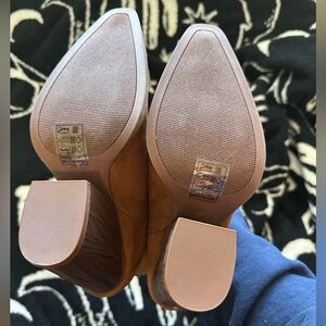 Never been worn, tan suede like boots with zipper detail on the back. Raised heel and pointed toe style perfect for a night out