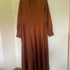 This casual brown gown by Dainty Jewells features a graceful bishop sleeve design and a classic crew neck. The dress is tailored with a mandarin collar and a full-length silhouette, making it a versatile choice for everyday wear. Its elegant style and rich color make it a standout piece for any casual occasion.