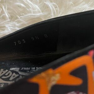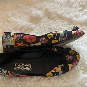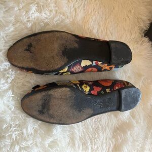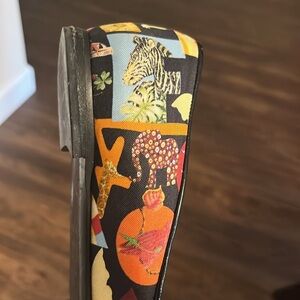 These vintage Used shoes have a silk fabric animal print pattern with solid black insole & 1/4 inch heel. They have a fringed end black ribbon across the top front. The bottom front soles have pavement!! Wear. . Not visible(price reflects this). . Otherwise alot of life left in them!!!