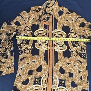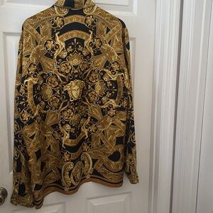 Elegant Versace shirt with intricate baroque patterns. Features a striking black and gold color scheme. Perfect for a bold fashion statement.