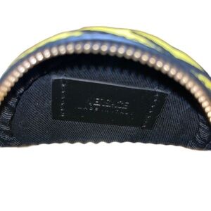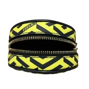 NWOT Versace La Greca Signature Round Pouch, a bag accessory. Black and bright summer yellow. Coated canvas with leather trim. Canvas lining. Zip closure at top. Has snap on back for attachment to your belt to wear as a beltbag. Perfect accessor for your purse/beach bacfor lipstick, keys, and cards. This product is equipped with RFID tags to prevent counterfeiting. Retails $325.