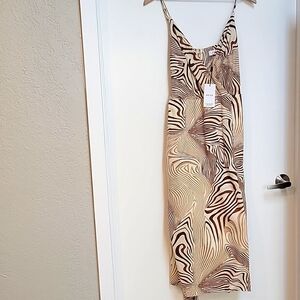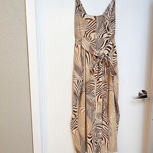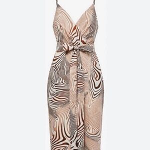 Step out in style with this elegant tan and brown zebra patterned wrap style dress. Perfect for any occasion, this dress offers a flattering fit and unique design.