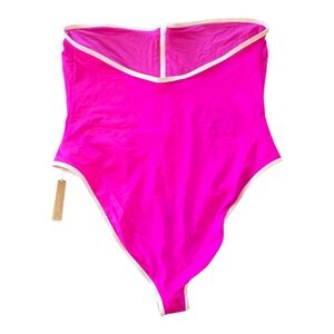 New with tags Skims istrapless and sporty, fushia pinkswimsuit. Features a brief back with medium coverage and a center front zipper. White its trim at top. Brand new excellent condition.