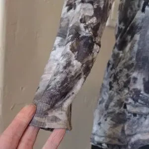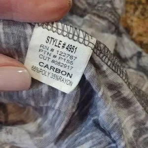 A designer twist on a long-sleeved tee! This stylish blouse by David Cline features a sleek design in classic gray and taupe tones. Subtle diagonal to the 'watercolor' pattern provides a slimming effect. The full-length sleeves with 5" cuffs, layered frills at bottom hem, and a bit of Hi-Lo styling elevate the design. It can be dressed up or down, and is a versatile addition to any wardrobe, perfect for both casual and formal occasions. Crafted from soft, lightweight fabric, it ensures comfort throughout the day.