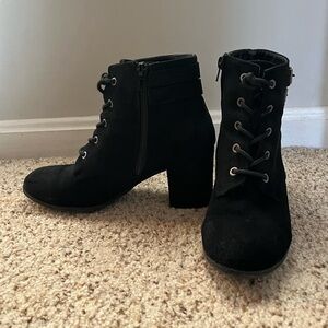 Looking for those subtle witch vibes or some office level goth boots? Then you’ve found them! Lovely black vegan suede with silver buckle details and an almond shaped toe. Heel is 3 inches - perfect for comfortable badassery! Only worn twice to two weddings, these are in excellent condition! Black size 7.