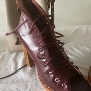 These Jeffrey Campbell ankle boots feature a rich burgundy hue and a stylish lace-up design, perfect for adding a touch of sophistication to any ensemble. Crafted with attention to detail, they boast a high heel and a sleek silhouette, making them a versatile choice for both casual and formal occasions.