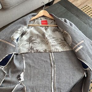Tommy Bahama men's recent two button blazer sport coat jacket. Gorgeous coloring and texture with pure Irish linen fabric. Pencil gray in color with a houndstooth pattern throughout. All pockets remain stitched and have never been opened. Dual vents and with a partial print lining.