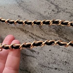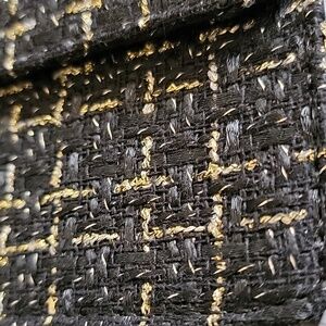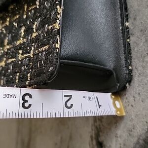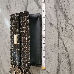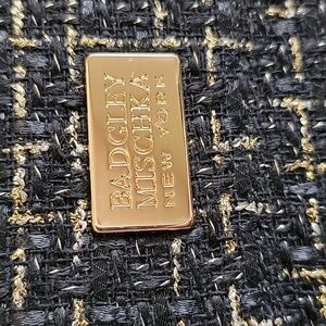This BADGLEY MISCHKA NY Clutch style shoulder tweed bag has adjustable style gold tone adjustable ways strap see pics for different ways to wear there is magnetic snap closure small inside pocket and pretty black tweed with golden thread and black faux leather trim and lined inside with black material the measurements are 9x6x2.5" approximately NWT perfect work or play
