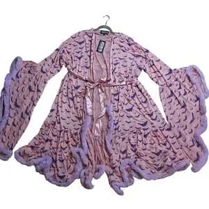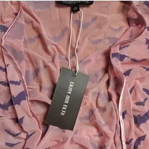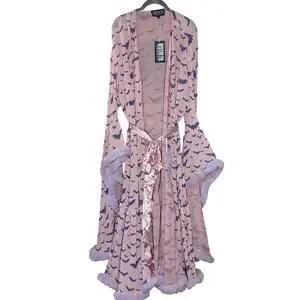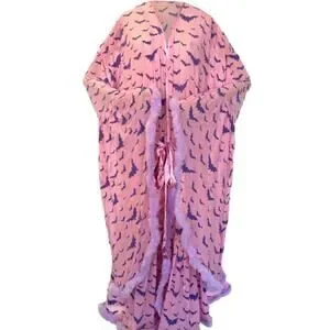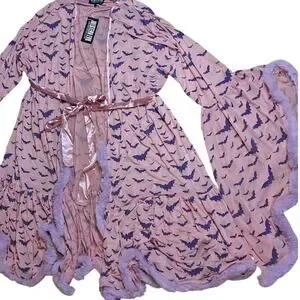 New from western evil womens one size fits all fits s-xxl easily with stretchy mesh fabric 45" long from shoulder pastel goth draculina window dead husband feathered robe pink with feather trim and flocked bat print all over