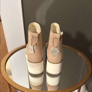 These tan ankle boots feature a soft suede material and a substantial white platform sole, offering both style and height. The slip-on design with elastic side panels ensures a comfortable fit, making them a versatile addition to any wardrobe.