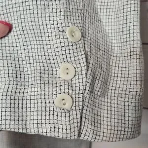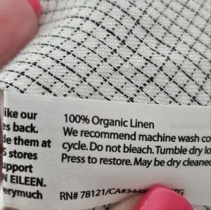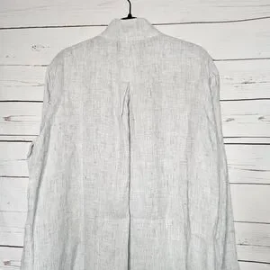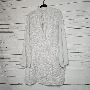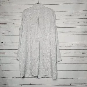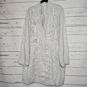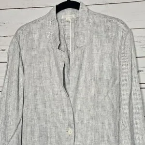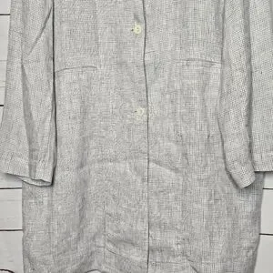 Eileen Fisher Long Linen Jacket. Gray and White Check Pattern. 2 Button Closure. Notched Collar, can be worn flat or folded. Welt Front Pockets. Inverted Back Pleat. Long Sleeve with 3 Button Cuffs. Oversized. 100% Organic Linen. Great Preowned Condition. Size Large