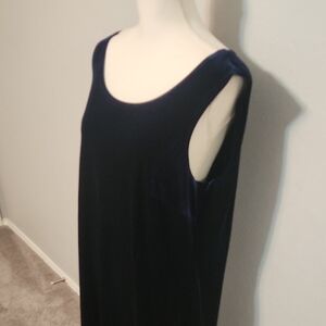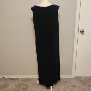 This stunning navy velvet maxi dress features a sleeveless design and a scoop neckline, perfect for a cocktail night out. Its sheath style offers a sleek and form-fitting silhouette, making it a timeless and versatile choice for any elegant occasion. See last photo for color.