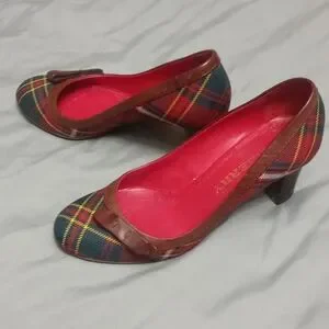 Step out in style with these Burberry women's plaid pumps. Featuring a classic brown and red design, these shoes offer both elegance and comfort. Perfect for any occasion. Has a few scuff as they were worn and loved. Comes with the box that is in mint condition for those who love the shoe box almost as much as the shoes! The shoe runs a little big so, keep this in mind if you are a smaller size 5.5. A person on the smaller side of a size 6 would definetly be able to wear these heels comfortably.