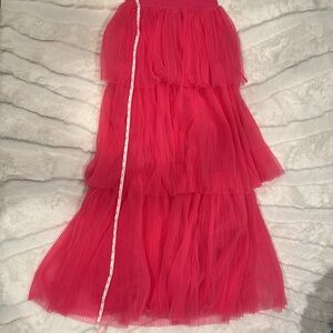 This stunning skirt starts with a high, banded waist that tops a pleated tulle maxi skirt that boasts a tiered, A-line silhouette. The skirt features a hidden back zipper/ clasp.
