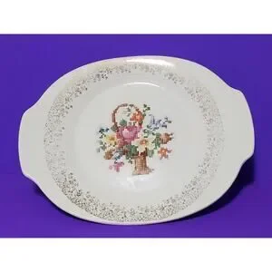 This vintage Salem China serving platter is a beautiful addition to any collection. The oval shape and multicolor floral pattern make it a great piece for serving up your favorite dishes. With handles on both sides, it's perfect for displaying on a table or in a kitchen.