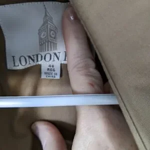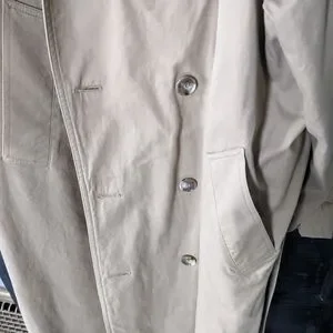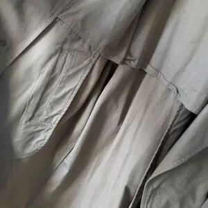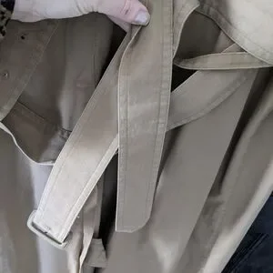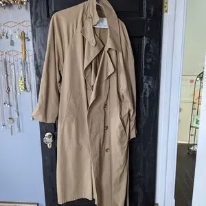 Elevate your wardrobe with this classic tan trench coat. Perfect for any occasion, this coat offers both style and comfort. 50 length, pit to pit 24, sleeves 17 long