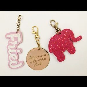 Includes 3 keychains: “Fried” rubber keychain, “I’m on an all carb diet” metal keychain, and Animal Cookie plush fabric keychain
