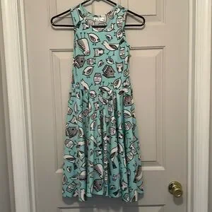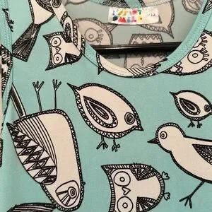 Dress is sleeveless turquoise, cute black and white bird design with full circle skirt to twirl all day long! Girls size 8-10, length 35”, 14” across chest. Machine washable.