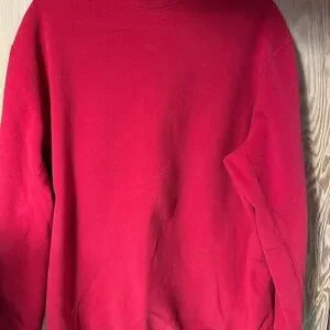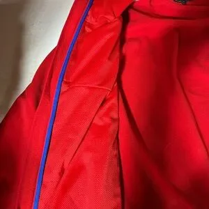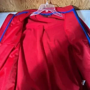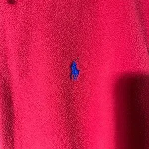 Cozy fleece red large performance jacket with three zip pockets on the front. Iconic blue pony logo on the chest. Perfect for casual wear. Excellent condition. Only wore a few times. No holes/stains/tears. Comes from a non smoking and pet free home.