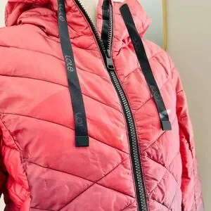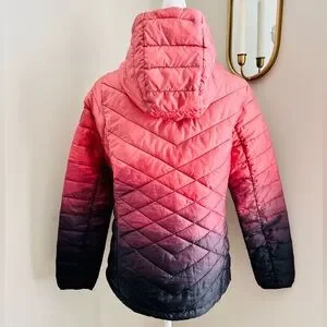 This hood puffer coat is down filled and super cute!! It’s very lightweight and works great as a top layer on a cold day. Features diamond quilted design and ombré coloring. Has front pockets as well.