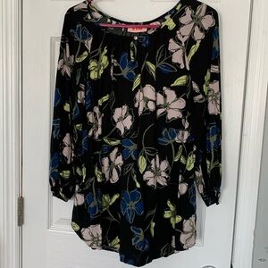 Hardly worn black Evri blouse with floral pattern in blue, cream, and yellow. Made of 100% rayon, has no stretch.