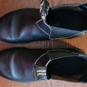 Blundstone Chelsea Boots. Black. Size 5 Australian--I usually wear a 7.5 US womens. Leather upper, balance man made. Lots of life left in these wonderful boots. Original footbed included, but removable if orthotic or something else works better for you. From a scent free, smoke free, cat-friendly house.