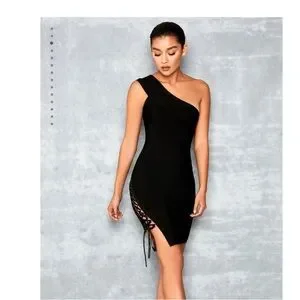 This stunning black dress features an asymmetrical one-shoulder neckline and a ruched design that adds texture and elegance. Perfect for a cocktail event, its bodycon style ensures a flattering fit, while the embellished details provide a touch of glamour.