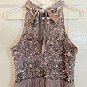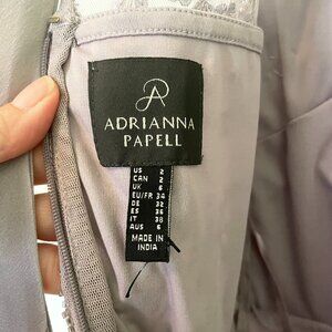 PROM Adrianna Papell dusty lavender beaded evening gown size 2. The color is a beautiful dusty lavender shade. The top has a silk tie around the neck. The bodice is intricately beaded in the front and back. The beads are in perfect condition. The dress is fully lined. There is a zipper in the back. The skirt of the dress is layered lightweight toile in the same color. The dress is in perfect condition and fits well for a size small or 2.