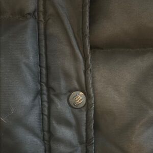 Stylish black puffer jacket with fur trim. Features a cozy hood and button closure.