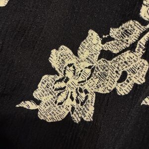 Peasant style babydoll blouse in black with dark tan floral print. Good condition. No size tag, but my measurements seem to amount to a 2X with room.