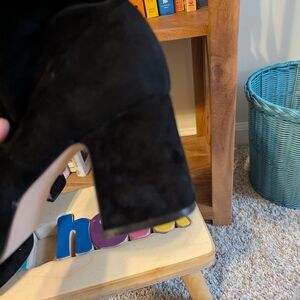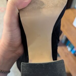 Step out in style with these chic black suede ankle boots. Perfect for any occasion, these boots offer both comfort and elegance. purchased from Anthropologie in 2022, these unique platform boots with chunky heel will elevate any outfit!