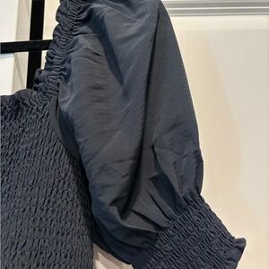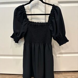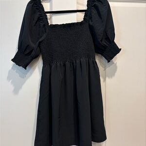 Elegant black dress with smocked bodice. Puff sleeves add charm. Perfect for any occasion.