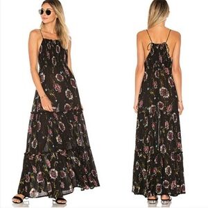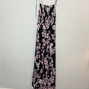 -black maxi length dress with a colorful floral print allover and self tie shoulder straps