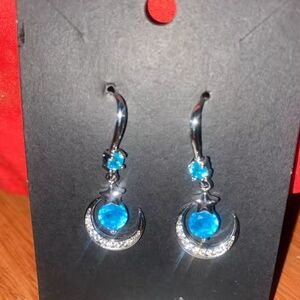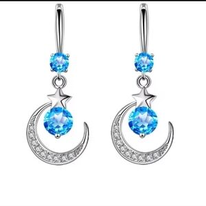 Elegant earrings featuring a crescent moon and star design. Accented with sparkling blue gemstones. Perfect for adding a touch of celestial charm.