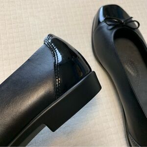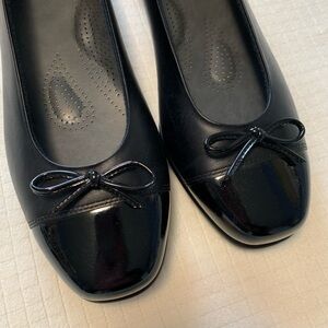 Classic black on black leather flats with adorable bow accents from SAS. Style name: Coco. Two-toned, slip-on flats with premium leather upper, removable TRIPAD comfort foot bed and soft interior lining. Cushioned outsole is made of manmade materials which are durable, flexible and allow for all day wear. 7/8” heels. Structured heel pads. Size 8.5M. No box. Never been worn. NWT! HL:45