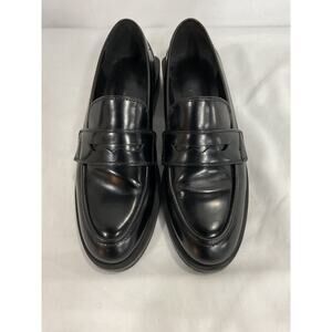 Charles David 'Delusion' Black Platform Loafers Size 6: round toe, slip-on, penny keeper detail at vamp, stacked block heel and platform, leather upper, synthetic lining, and sole.