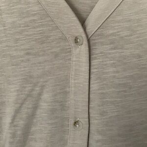 V-neck, three tiered, button up. Has pockets. Worn once, excellent condition. Cotton/polyester.