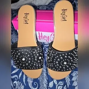 Step out in style with these chic black studded slides from Hey Girl, by Corkys . Perfect for casual outings, these shoes offer both comfort and flair. Never worn. In original box with cloth covers. Smoke free home.