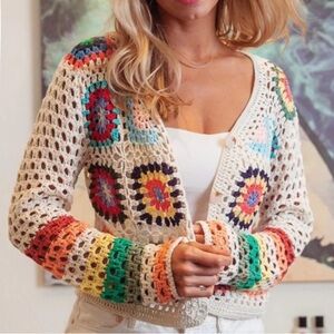 Floral Multi Color Granny Square Crochet Striped Bell Sleeve Cardigan Sweater S
