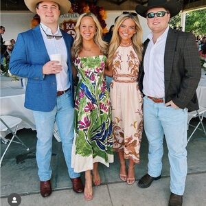 Elegant midi dress with floral print. Features green and pink hues. Perfect for any occasion.