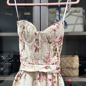 In excellent condition no major flaws. Absolutely stunning dress! Elegant cream dress with a beautiful floral pattern. Perfect for any occasion.