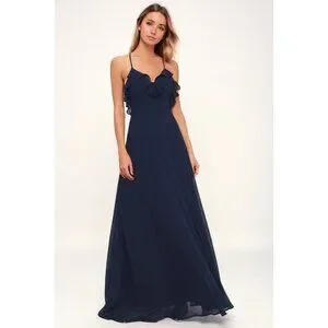 Lulus Exclusive! Got an event coming up? The Lulus Metropolitan Navy Blue Ruffled Maxi Dress is the perfect option! Elegant chiffon falls from crisscrossing, adjustable spaghetti straps, into a ruffled, V-neckline, and darted bodice. High, fitted waist and breezy full A-line maxi skirt. Hidden back zipper/clasp.