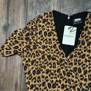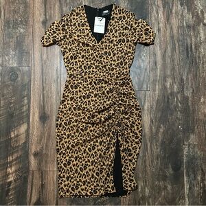 Bardot Nicola Midi dress in leopard print size 4 / XS BNWT. Mock wrap front with rouched detail on the side that’s adjustable. Short sleeves with a fully lined body and hidden back zipper