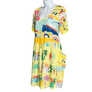 This vintage Jams World short sleeve dress features a tropical yellow cruise ship pattern, perfect for your next vacation. The shift has a scoop neckline and side pouch pockets.