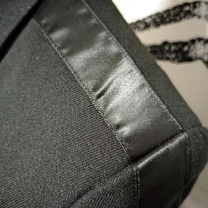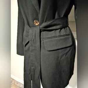 A satin stripe that that goes from the shoulder down the sleeve and ending at the cuff is one of many details in this jacket! 2 beautiful brown buttons, a belted waistband with 2 hoops, 3 faux pockets and a luxurious lining are all pieces of the design of the blazer that sets it apart from others!