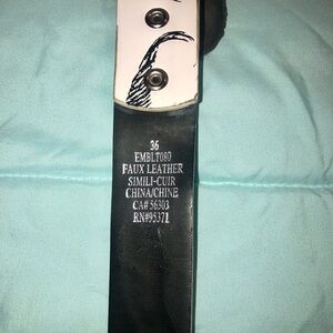 Belt is faux leather and is white with black staches in different styles
