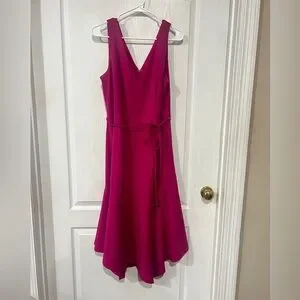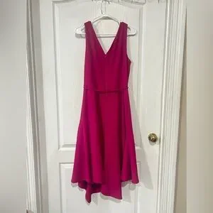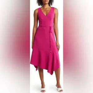 A slim sash belts the waist of this stretchy scuba-crepe dress designed with an asymmtric hemline. V-neck Sleeveless Back zip closure Lined 94% polyester, 6% spandex Machine wash, line dry Imported M