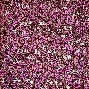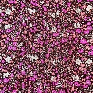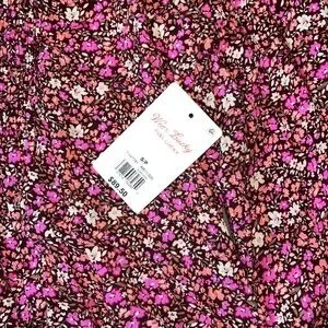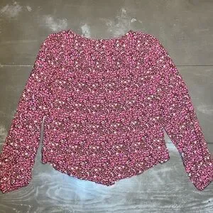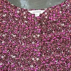 Lucky brand long sleeve blouse. Fabric is burgundy brown with peach, pink, beige and olive green small floral pattern. Full button front, fabric covering buttons. Front center slightly linear smocked. This makes looser fit across bottom. Elastic banded at end of sleeves. Pleated across back. Pictures do not show how cute this shirt is! Ladies small brand new with tags original $89.50