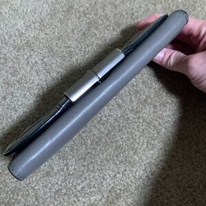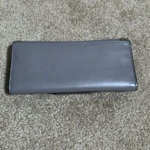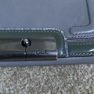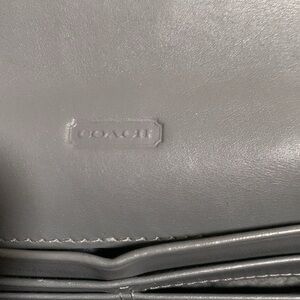 Nice vintage leather Coach wallet in two tone gray. Snaps close, outside pocket with two slots and a zippered pocket on the inside. Has 14 slots for cards, IDs, etc. in excellent condition but there is one small place where the coating has come off. See last pic. Still a very nice wallet!